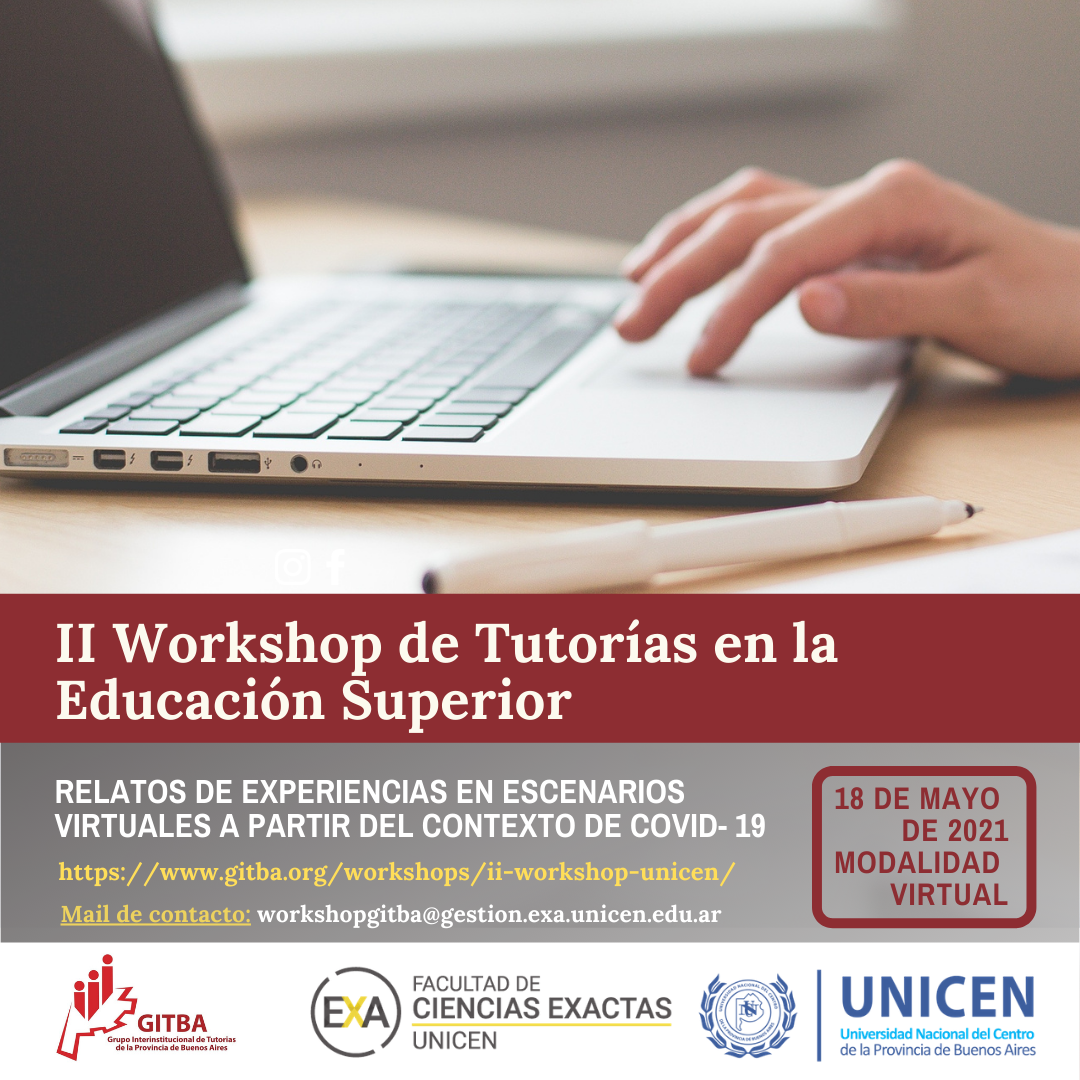 El “II Workshop de Tutorías en la Educación Superior: Relatos de experiencias en escenarios virtuales a partir del contexto de Covid – 19” es organizado por el Grupo Interinstitucional de Tutorías de la Provincia de Buenos Aires (GITBA) y la Universidad Nacional del Centro de la Provincia de Buenos Aires (UNCPBA).