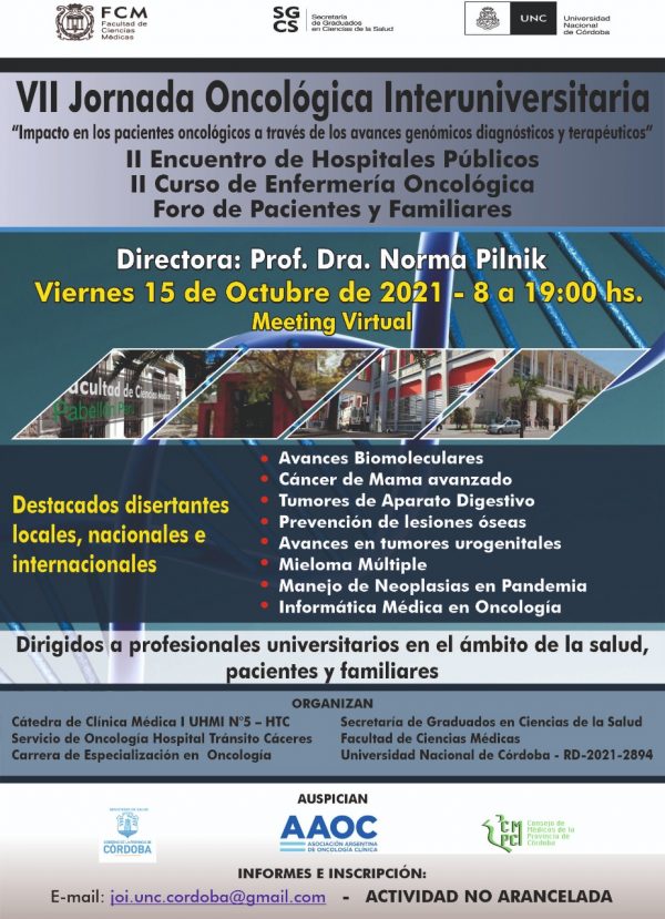 Invitamos a participar de las VIII Jornada Oncológica Interuniversitaria. II Encuentro de Hospitales Públicos. II Curso de Enfermería Oncológica. Foro de pacientes y familiare. “Impacto en los pacientes oncológicos a través de los avances genómicos, diagnósticos y terapéuticos”, se desarrollarán de manera virtual a través de la plataforma zoom, el día viernes 15 de octubre de 2021.