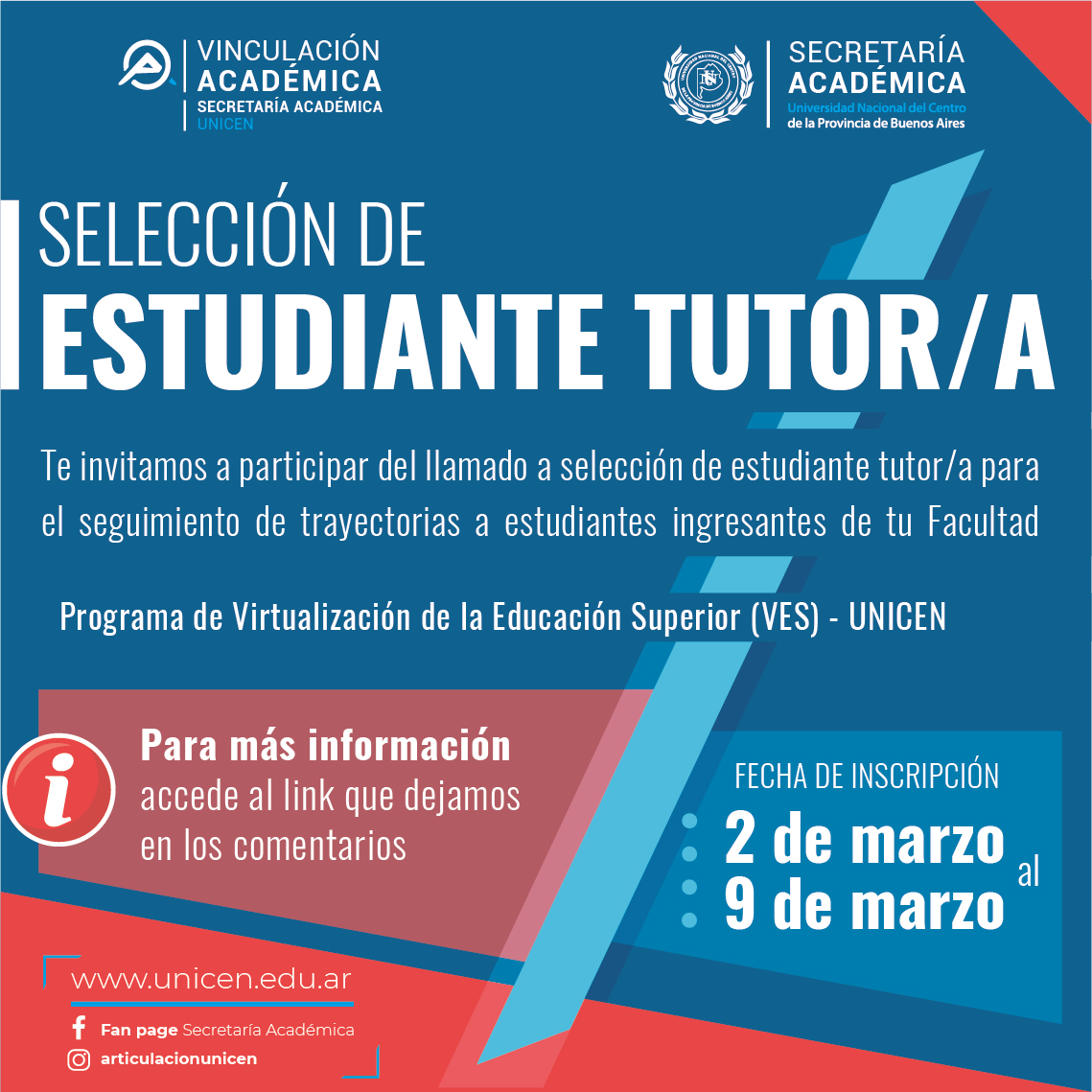 El área de Vinculación Académica de la Secretaría Académica de la Universidad Nacional del Centro de la Provincia de Buenos Aires convoca a inscripción para la selección de estudiantes avanzados que cumplirán la función de tutores pares, en el marco del Plan de Virtualización de la Educación Superior (Plan VES-UNICEN).